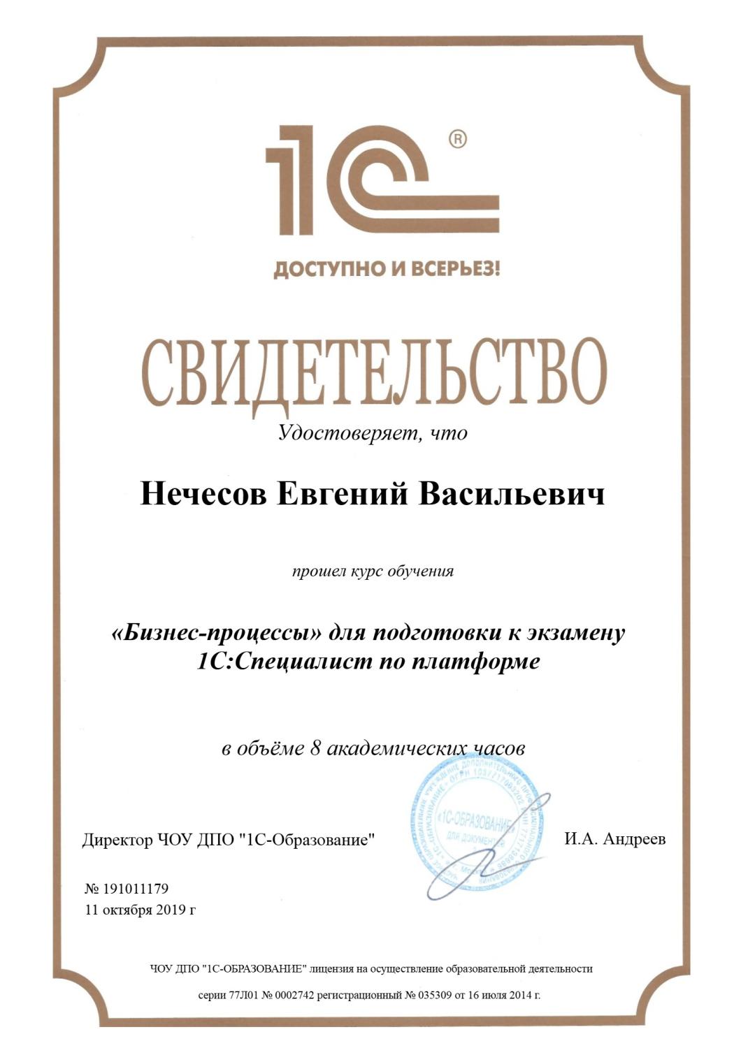 Свидетельство о прохождении курса «Бизнес-процессы в 1С»